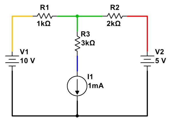 Here is a simple example of circuit analysis of using the above example, with two voltage sources and a current source: