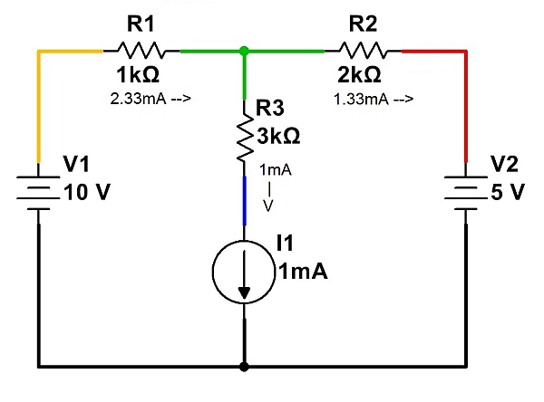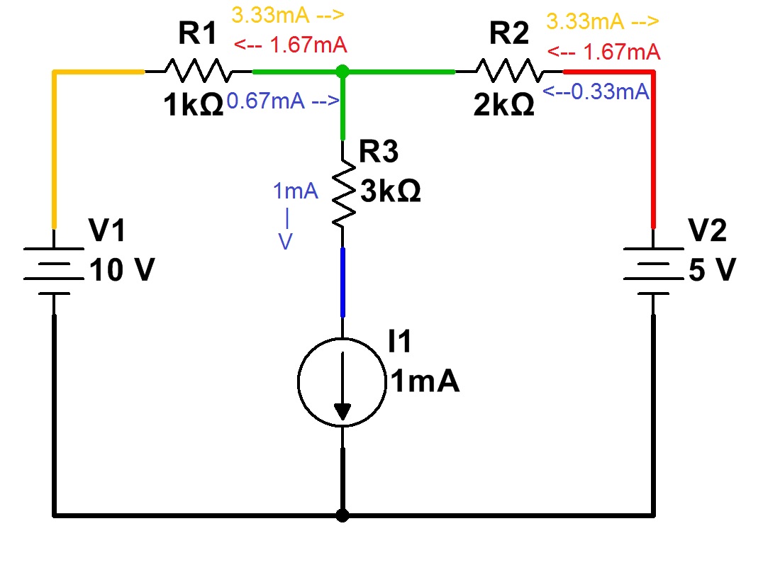 Note that Kirchoff’s Current Law (net current flow into or out of a point is zero) must be satisfied for each point in the circuit. For example, at the node represented in green, 2.33mA of current is flowing in through R1. This current must leave the node, and therefore 1mA flows through R3 and 1.33mA flows through R2. The net current into the node is therefore zero, so no charge accumulates over time.