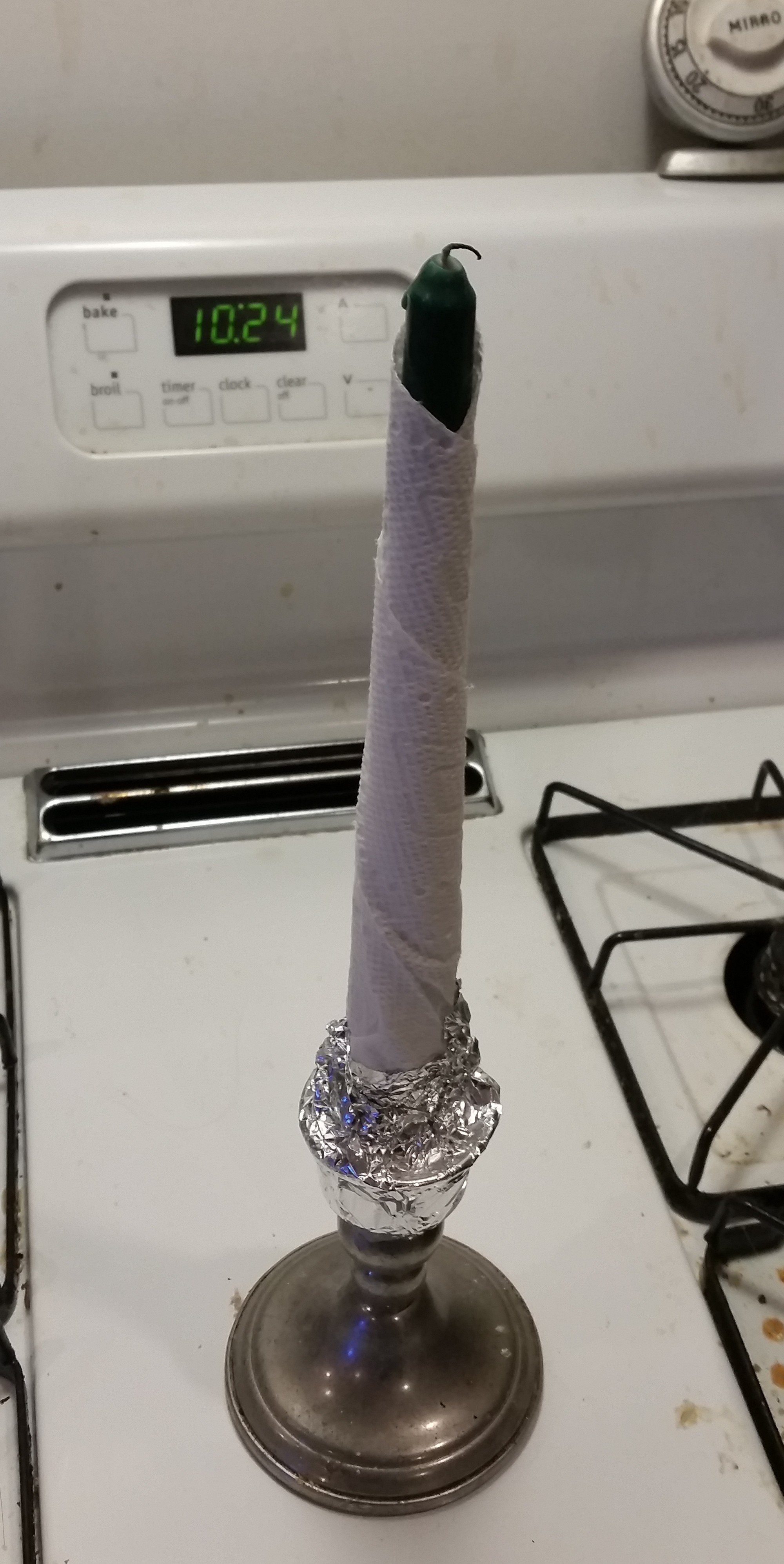Wrap the candle tightly in a paper towel. Ideally, the towel should extend up to the top. (I’m not very good at this yet.)