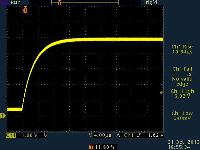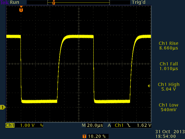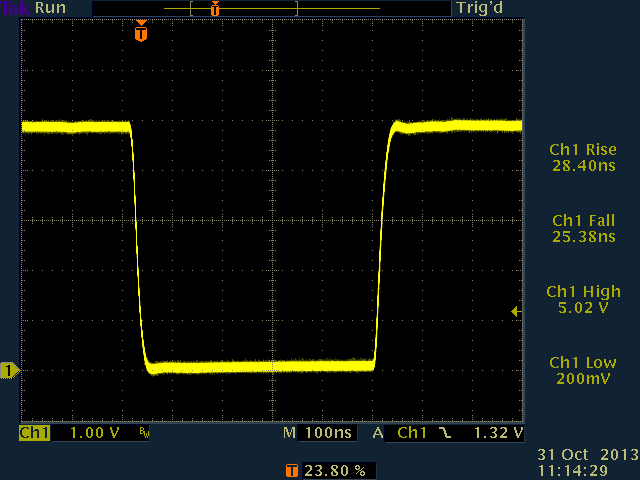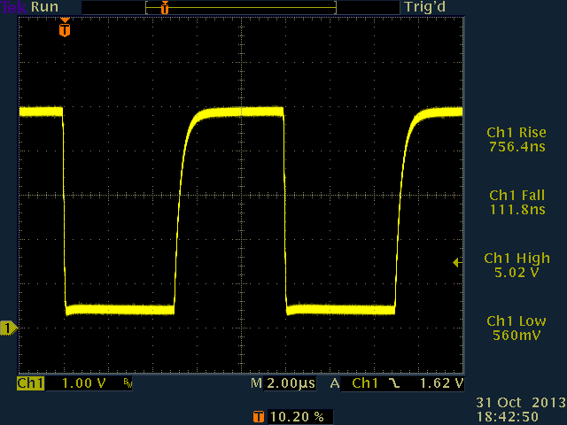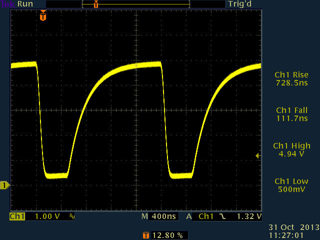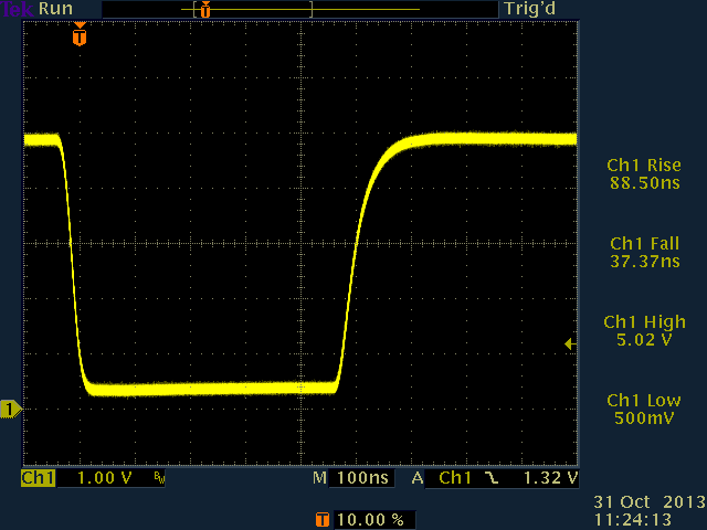 Next, 100pF capacitance was added. This had little or no effect on the actively-driven falling edge, but did start to affect the pulled-up rising edge.