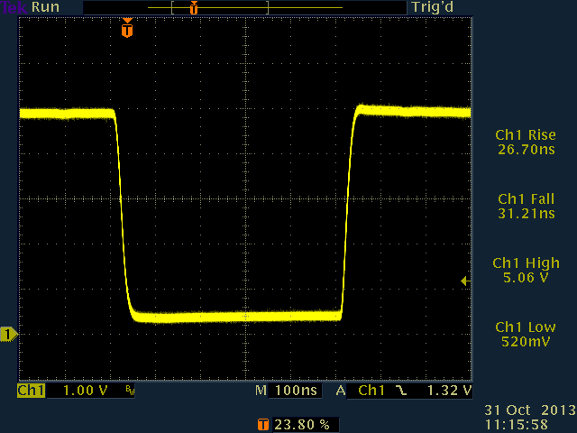 The first experiment was at full speed (running on the internal 8MHz clock): a 500ns pulse, with the pin being actively driven high and low. No capacitance was added, and no pull-up resistor was used.