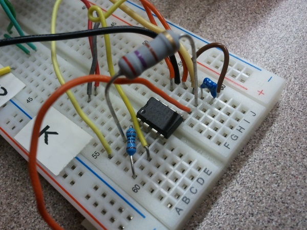 These risetimes could, of course, have been calculated in terms of time constants (tau = RC), but it’s always nice to see actual results produced by actual hardware. One particular concern that I had was whether the PIC’s tristate functionality could really be relied upon to work this way, rather than as a relatively slow way to set up pin functionality upon initialization. It does indeed work nicely — apparently just as fast as actively toggling bits (although controlling both tristate and pin value would require swapping memory banks, which takes a few cycles.) For this test, the software simply remains in the TRISIO bank.