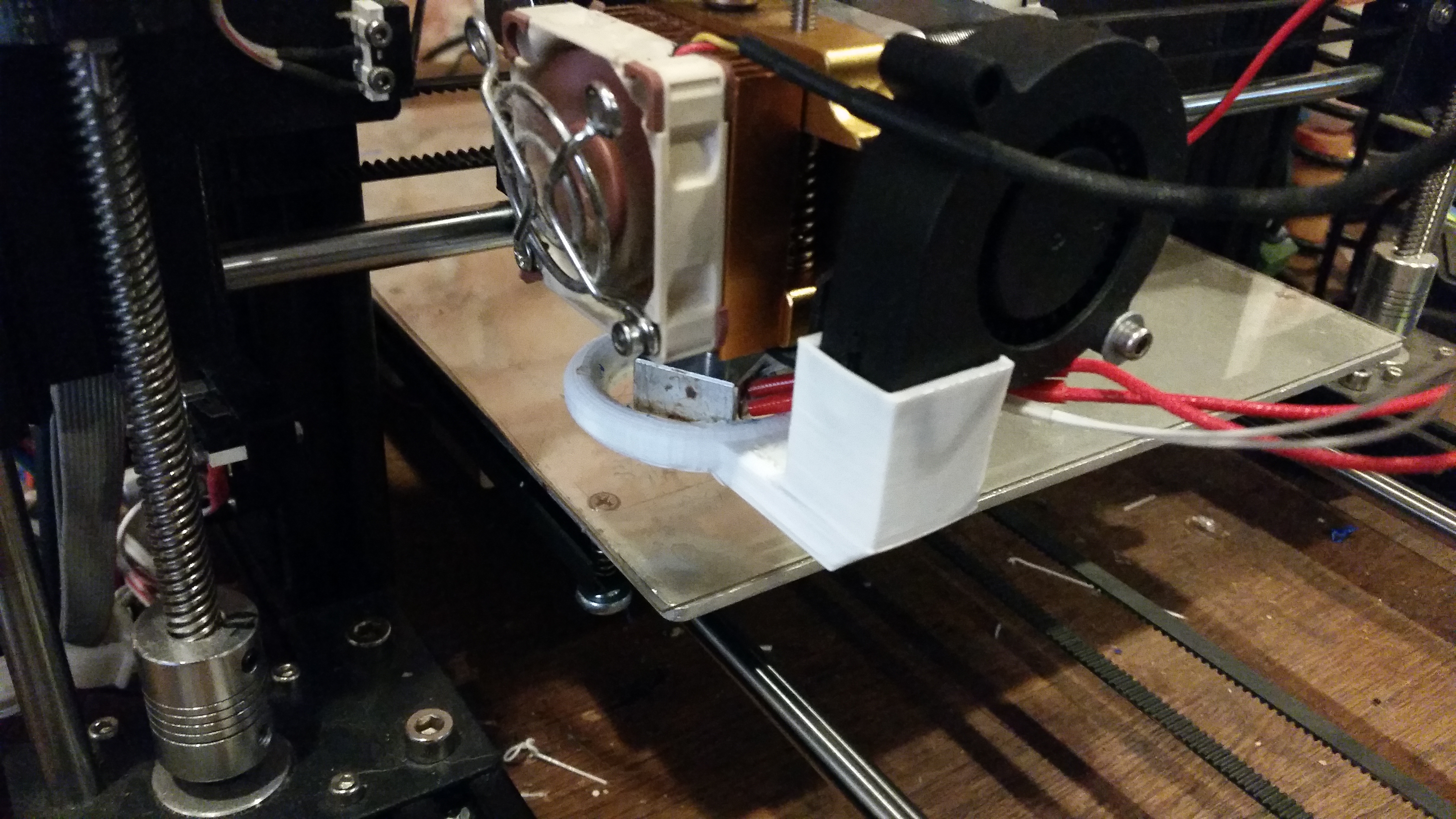 I found a fan shroud design on Thingiverse that looked like it might fit, printed it out, and installed it. This is actually the original idea behind “RepRap”-style 3D printers — that they should be able to make many of the parts for them, themselves. I had to cut into one side and add a washer to get it to work on my printer, but it’s helped significantly with build quality.