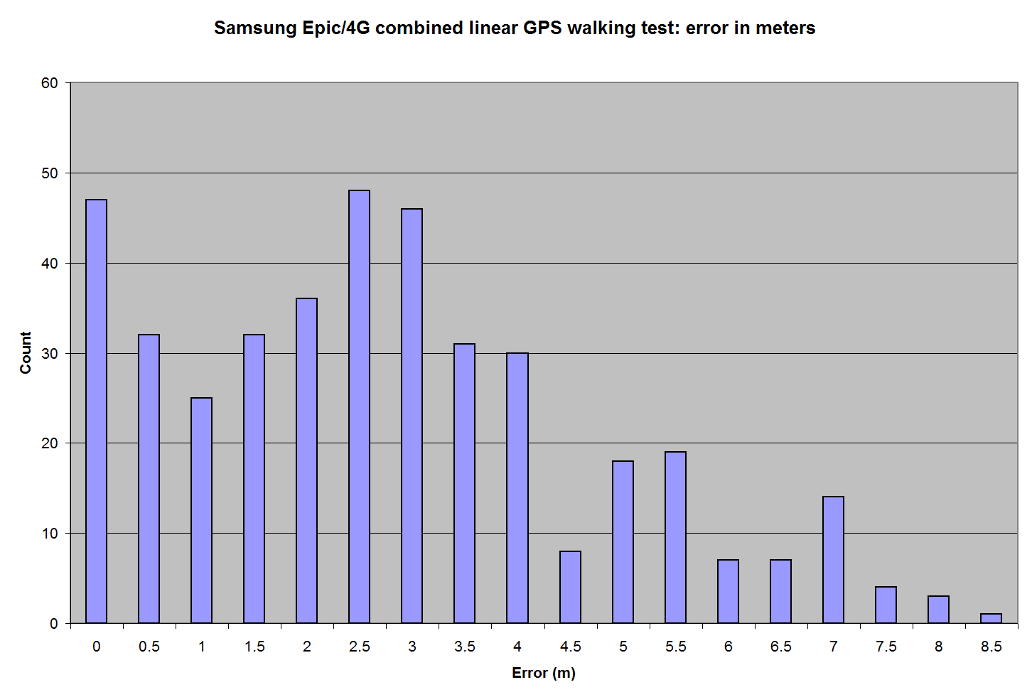 Since I use my phone’s GPS for many tasks, I decided to try an independent walking test of the GPS accuracy on the Epic 4G. I found a long, straight stretch of sidewalk and used Google Earth to determine the latitude and longitude of the endpoints (roughly 333m apart). With the latitude and longitude of these points recorded, I walked from one point to the other and back along the line (with an accuracy of maybe 10cm or so), recording the track. For each recorded point, I took the measured longitude, calculated the expected latitude value, and noted the absolute difference between this value and the actual measured latitude for that point. The mean error in latitude was ~3.0087m, with a standard deviation of ~2.003m. The worst-case point was ~8.579m off.