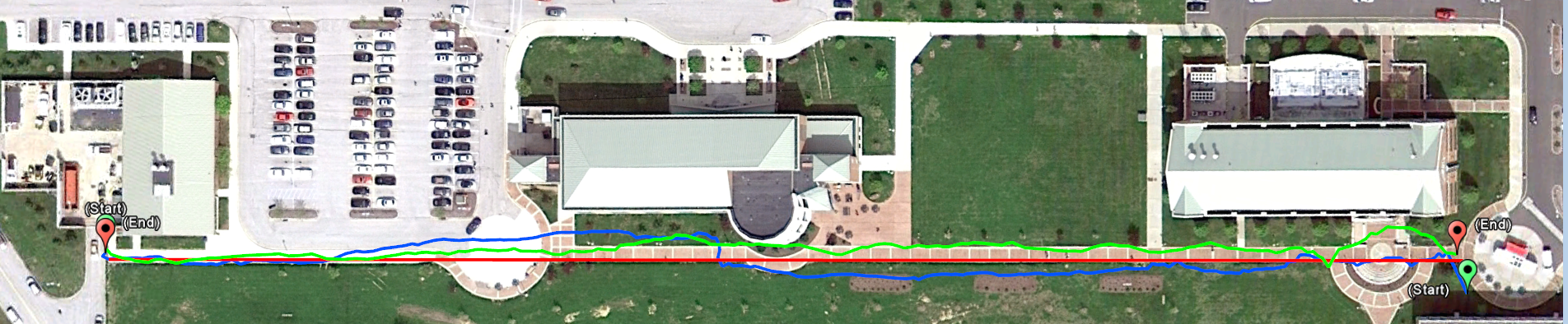 Here is a visual track for the test; green and blue represent the measured tracks, while red represents the actual path walked:
