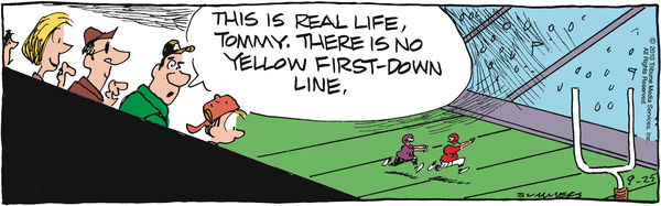 The man (father?) in this cartoon appears annoyed that the boy didn’t understand that the first-down line is a figment of the NFL computers’ imagination. Given a little thought, this makes sense — there is no realistic way to erase and repaint the line on the field so quickly, so it must be CG. But for a small child who had only seen football games on TV (and given his age, always with the CG additions), it’s a relatively easy mistake to make. If the graphics had been a bit more subtle (perhaps a corporate logo digitally painted onto the field?), it could well be mistaken for real field coloration.
