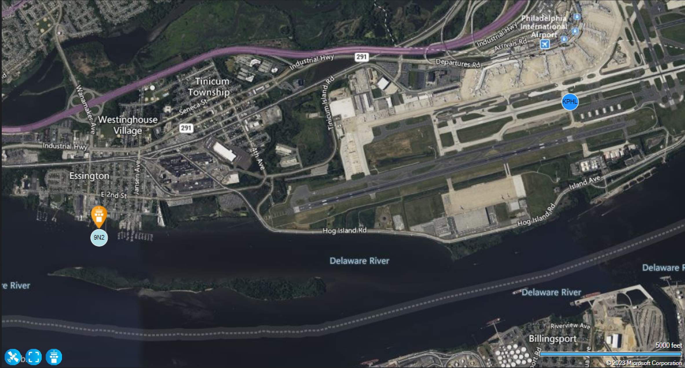 The symbols 9N2 and KPHL on the map represent the (single geometric point) locations that NeoFly has for those two airports. And the approach end of 9R (which is where the plane touches down, if all goes well) is actually closer to the 9N2 marker than it is to the KPHL one. So it must have thought I landed in the Delaware!