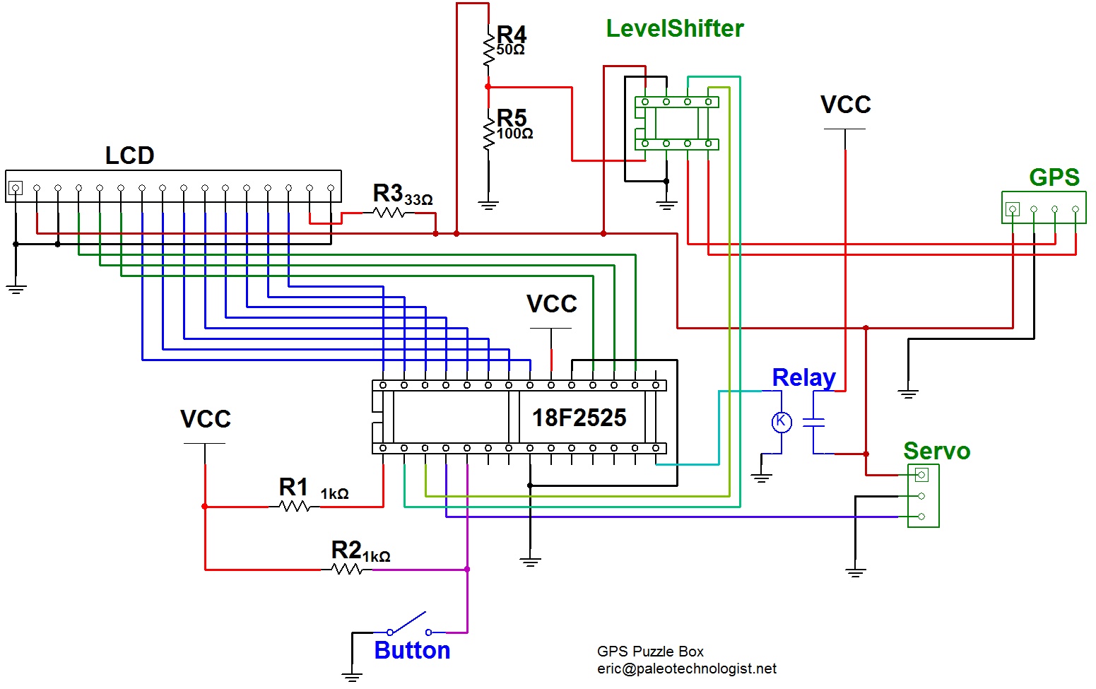 Here is the schematic for the device. A reed relay was used to control power to the peripherals; in standby mode, only the PIC draws power, waiting for the button to be pressed. In this mode, the I/O ports are tristated, and the onboard oscillator is run at 31kHz instead of the usual 8MHz.