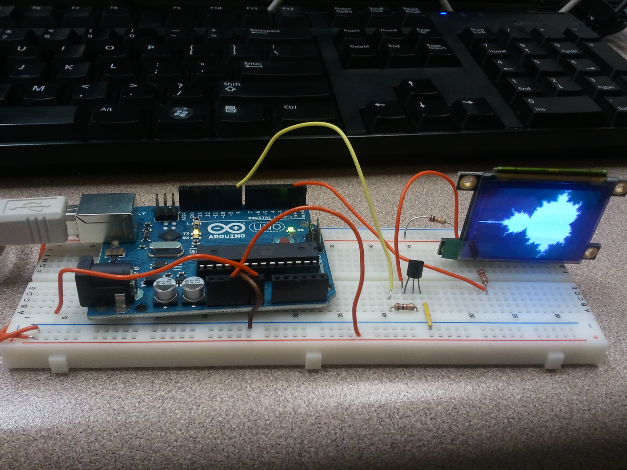 Reading through the datasheet, it turns out that the display supports many useful graphics primitives. So far, I’m only using clear-display and set-pixel, but the native GOLDELOX controller supports pixels, lines, polygons, circles, images, and bitblt operations, among others. It even has a slot for a microSD card. The display draws about 40mA of current (at 5V) when running.