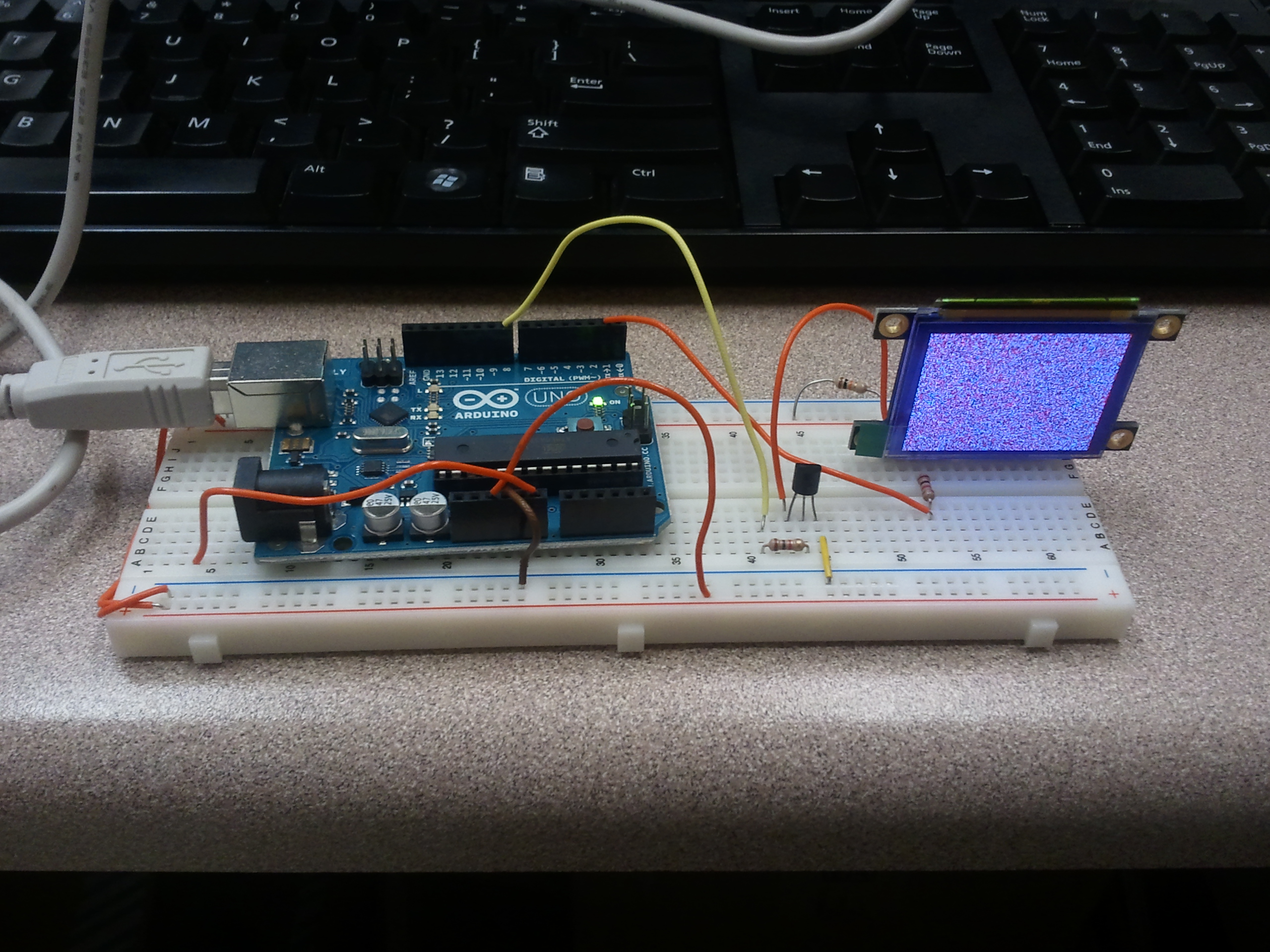 From there, it’s just a matter of sending the right commands (clear screen, set pixel, etc) to the display over the serial line. Half an hour of tinkering later (mostly because I initially didn’t read the description of the startup protocol in the instructions), I had an Arduino sketch running to display a raster scan of randomly-colored pixels.